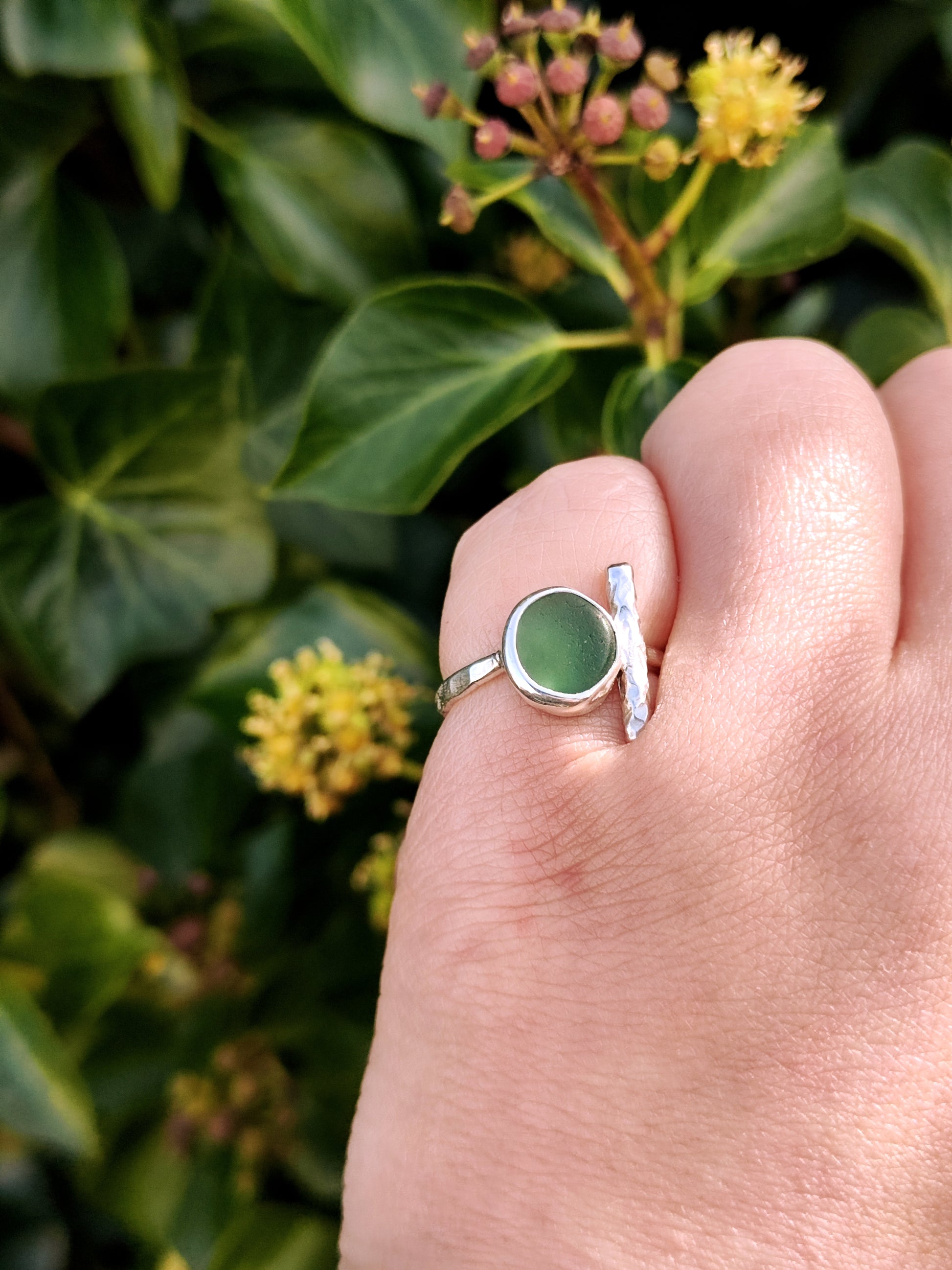 The almost perfect circle of this sea glass is so satisfying. In ambient light, it is a deep mossy green but when it catches the light, it shines that much brighter.